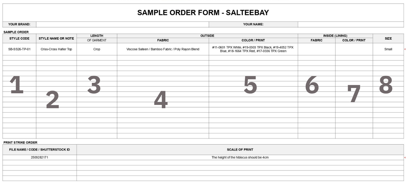 Indicate the size you’d like your samples in. It’s ideal to use a consistent size across all styles (often based on your fit model)